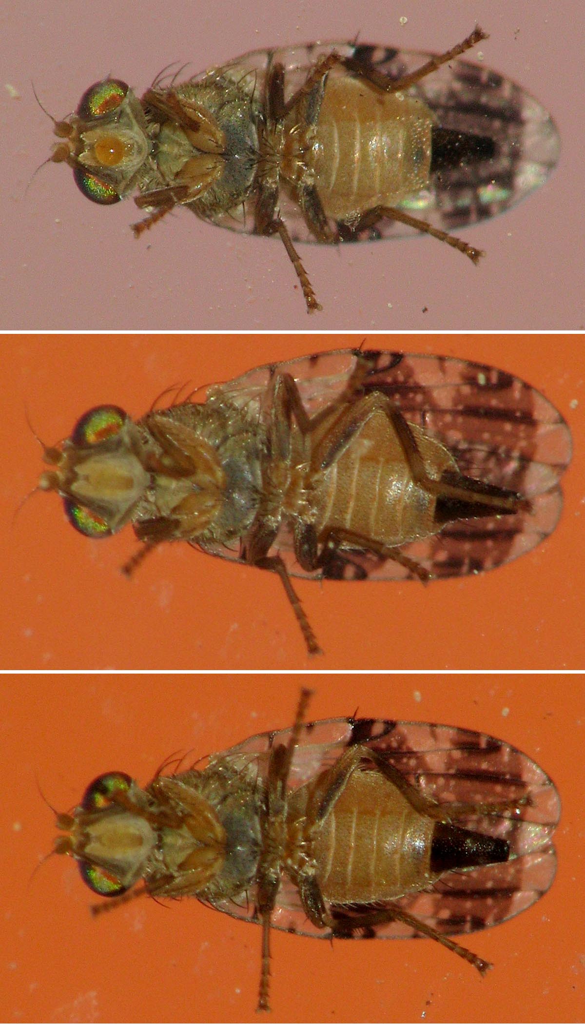 Hi, Some days ago a Tephritid female rested on my window. I could only photograph its lower side. As expected, it flew off when I cautiously opened the window. The wing markings made me think of Tephritis fomosa. Are there any better suggestions? Comments are appreciated! The location was southwestern Germany, 20 km west of Stuttgart. The red background is the roof of the neighbour's house. Many thanks, Sundew Sundew attached the following image: ![]() [263.55Kb] Edited by Sundew on 22-06-2022 00:06 |