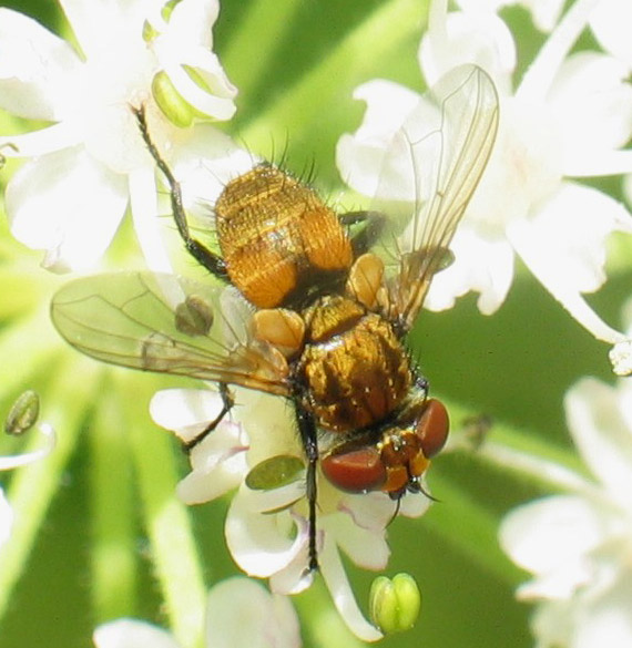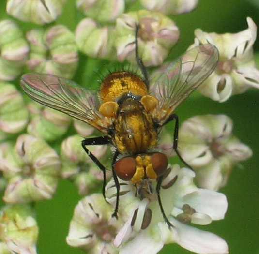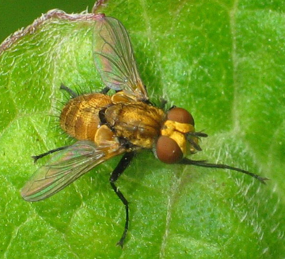 No, that species is much more yellow (in the male sex, it's a male). in the second pic, you can see the elongated third antennal segment and in the third the strongly incrassate arista, so it is a male E. pellucens. Theo |