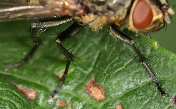 Hi Bernd, yes it helps - there seem to be 2 ad-bristles on tibia 2 of the female and the femur 3 shows no yellow hairs ventrally: more likely Pollenia rudis!