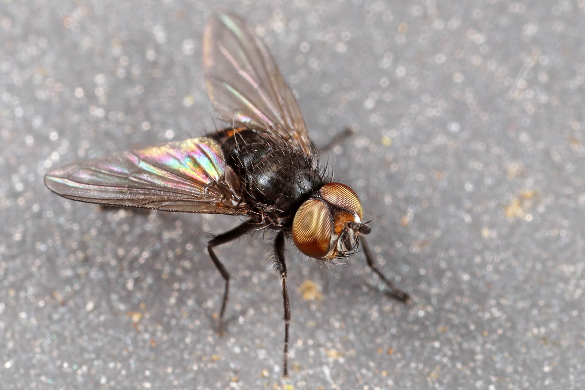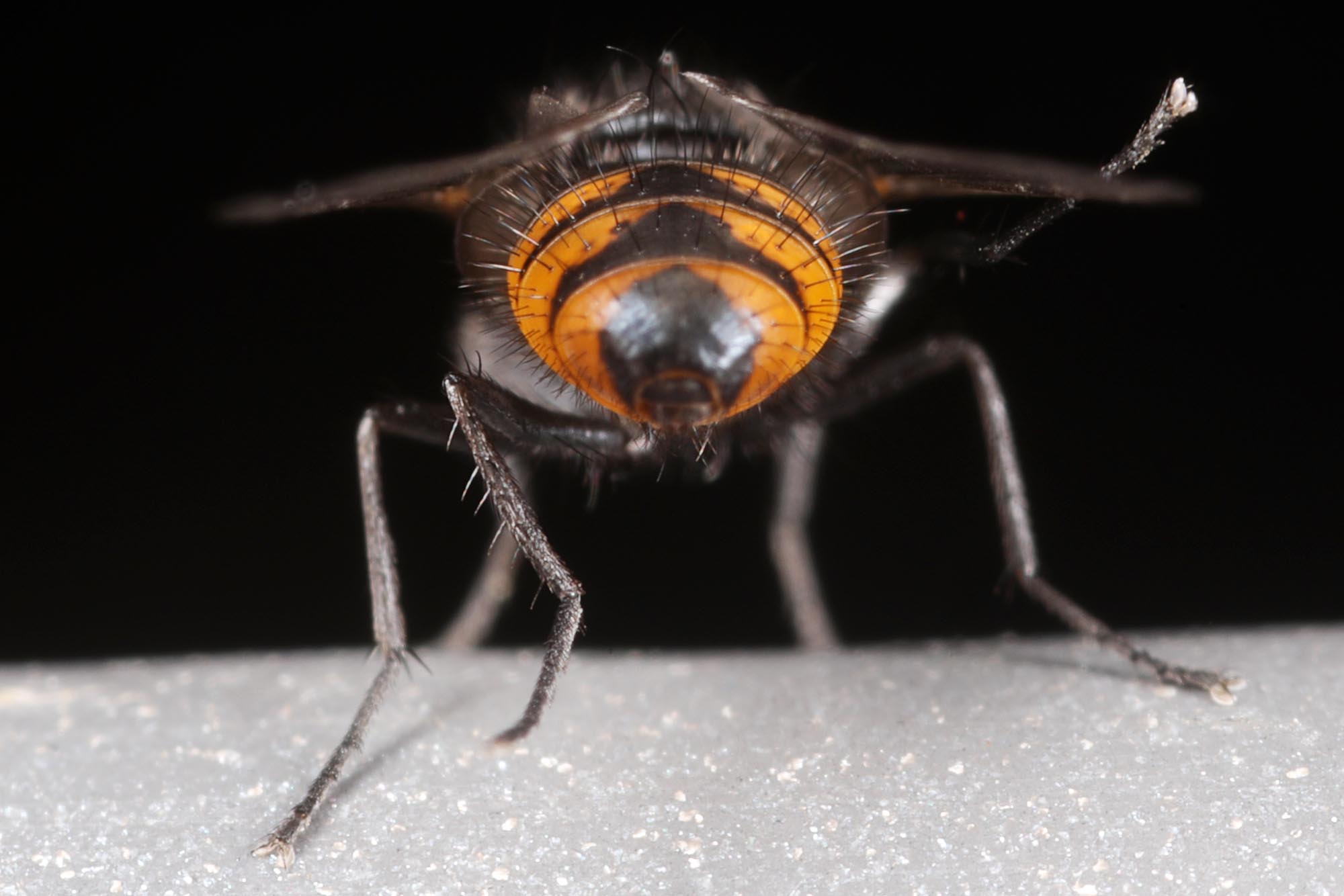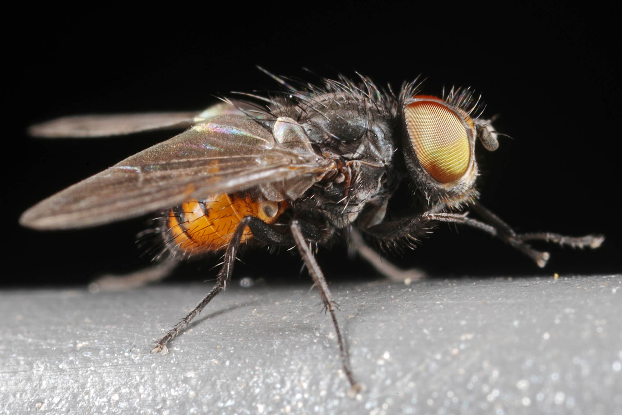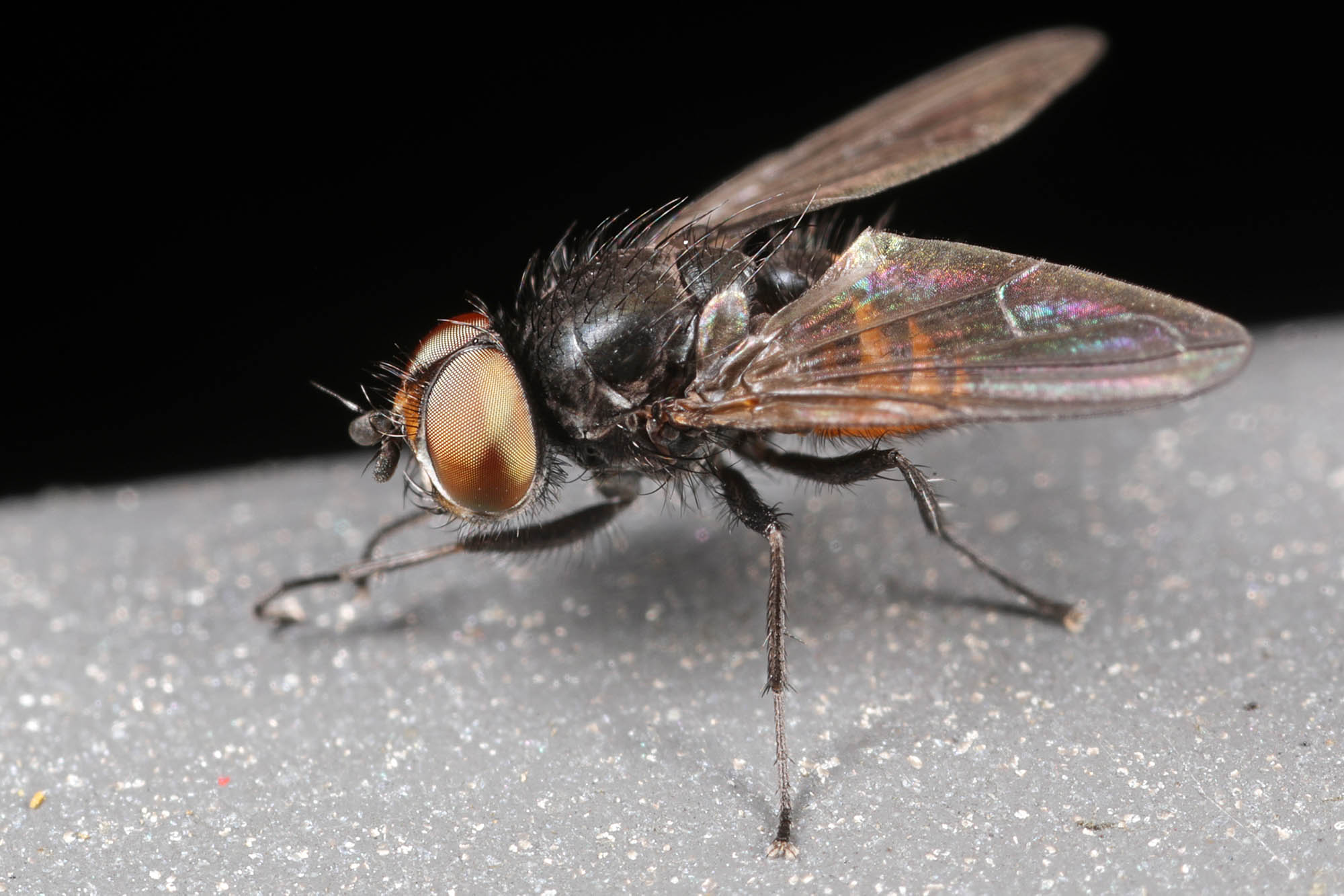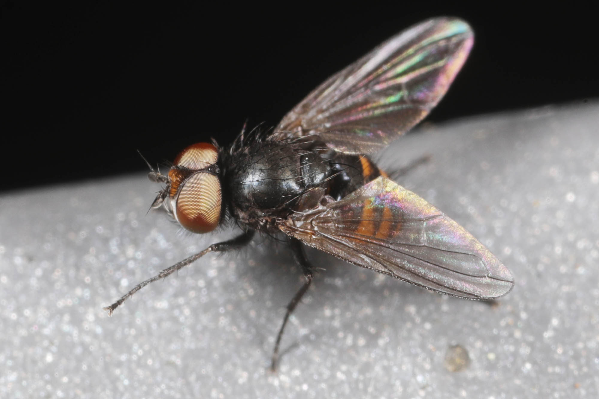 black 3mm fly with a black-and-yellow abdomen --> Rondania fasciata, Tachinidae