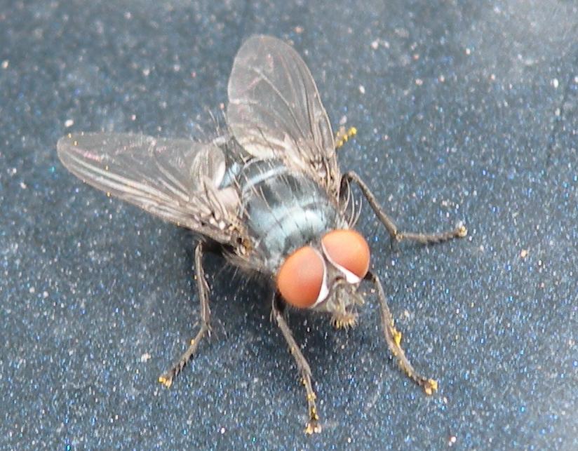 I meant to say pre-sutural ac set well forward of suture. Also shining white orbital plates. It should be a male gentilis - pre-sutural ia present, frons clearly narrower than ocellar triangle, palps brown. I should point out that I am never very comfortable IDing these small blue calliphorids, especially from photos - I would hesitate to entirely dismiss Onesia or Bellardia. Susan |