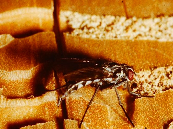 Please identify a medium size sarcophagid trying to oviposit (larvipoisit?) near the nests of Aculeata hymenopterans in a dead spruce.
