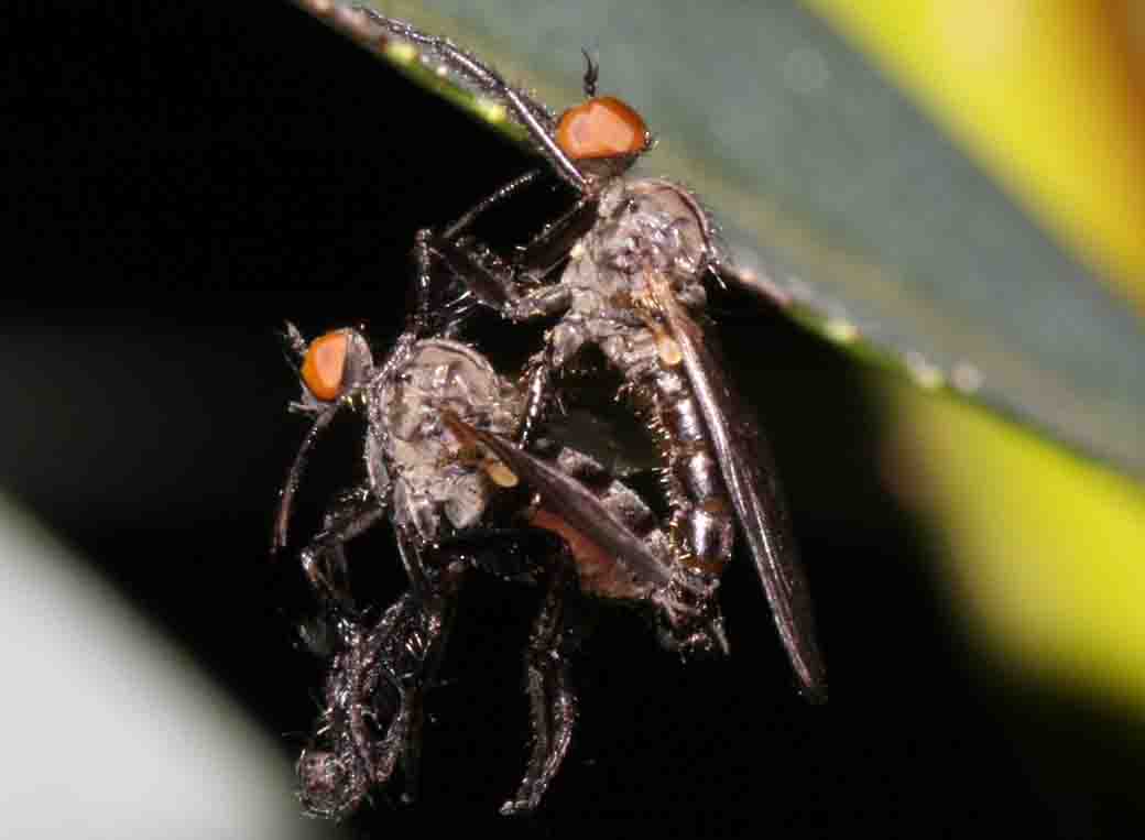 Dear Experts! Enclosed a diptera couple I found beginning of September in my garden in Amstetten (300m) in Lower Austria. The female is carrying rest of a prey. Some days before I saw this fly collecting nectar/pollen? on Soilitago. What ID could this be and is it living on prey or nectar? Thanks for help; Norbert. Norbert attached the following image: ![]() [44.27Kb] |