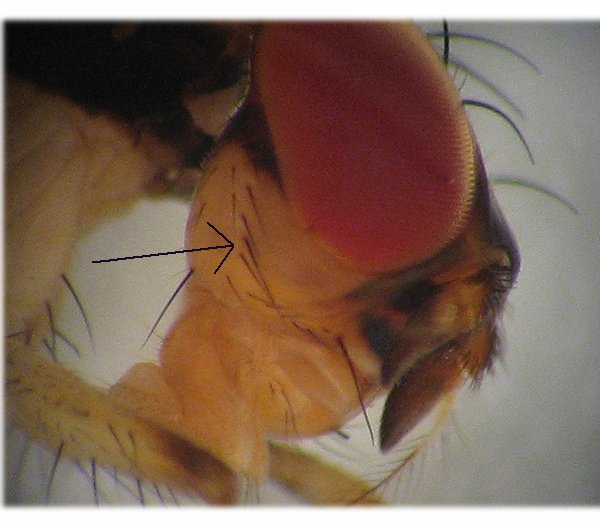 The 2 character states I consider I have made a mistake in are 1) the Dorsal Pre-apical bristle on the femur, because of the way the legs are folded and there are bristles all over the place, and 2) the vibrissae, in this photo I have indicated the bristles I have assumed are the vibrissae but I would be grateful for conformation, or if necessary correction.