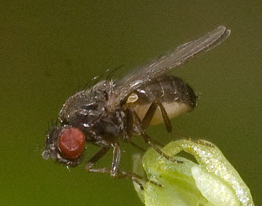 Hi, I dont know if Drosophila is correct, but Minettia has dark whole abdomen and dark haltera. Katka |