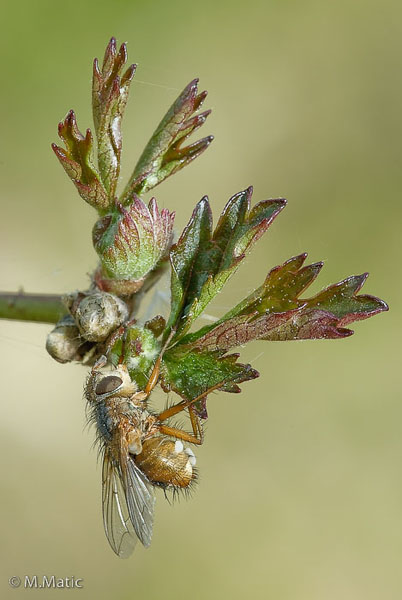 I think it was a coincidence. Fungus infected flies, in the finale stage of infection, often climbs to a high altitude. The infection, presumably, affects their oxygen intake and a higher altitude would then make breathing a bit easier. Unfortunately it also helps the fungus spors to spread easier and infect other flies. Even after they are dead you can find them holding on to whatever they chose to hold on to, and thef often hold their wings in an unnatural angle. I one day found hundreds of dead or dying Melanostoma syrphids, all fungus infected, all on top of various plants. Som even on top of eachother. A very sad sight. Edited by lagura on 12-01-2009 14:58 ![]() |