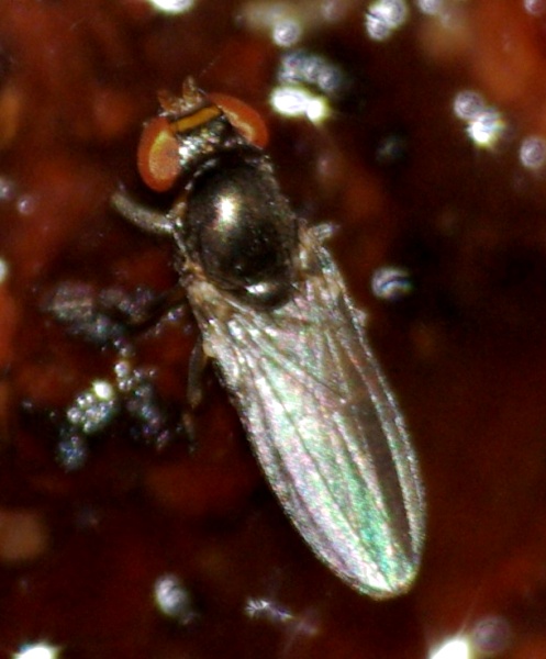 Hi, this 2-3 mm long fly was feeding on tree exudate of Platanus. Head has a nice orange stripe. Found in E-Hungary, June.