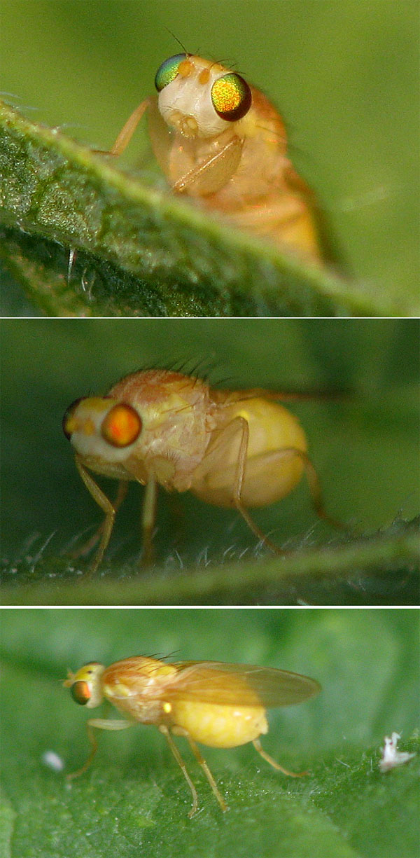 Physogastry (excessive swelling of the abdomen) is a common feature of female chyromyiids, but I find that the brilliant eye colours are a really good character.