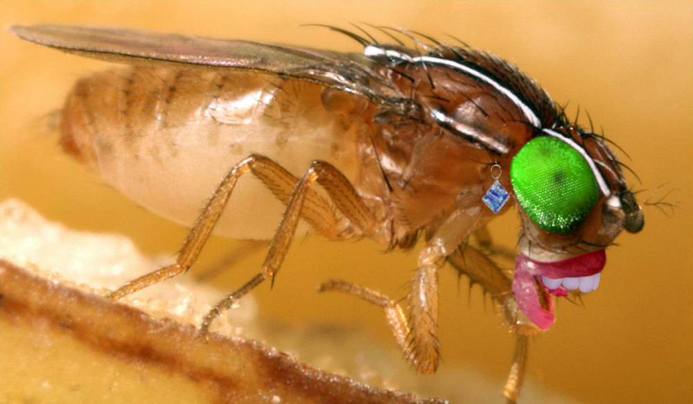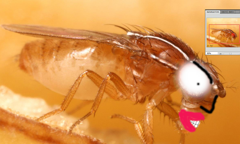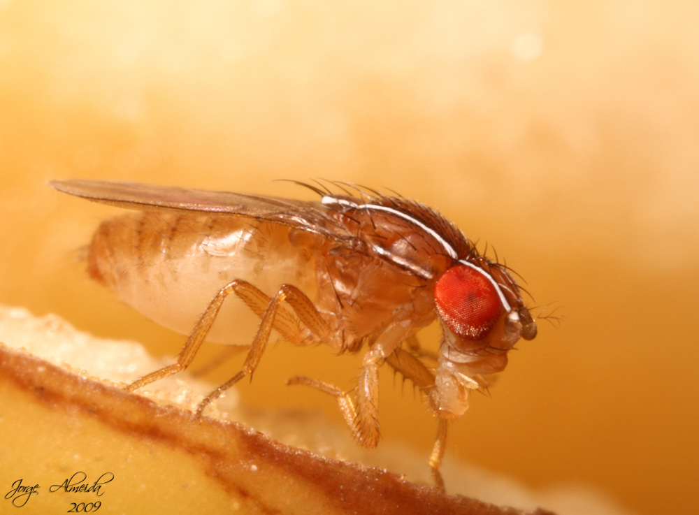 Hi to all This fly amazed me! Well I got these flies through a friend of mine who investigates the genetical relationships among Diptera, specially Drosophilidae. For those who don't know this fly is a Zaprionus indianus. The most striking feature is conspicuous and unmistakable: the presence of two long stripes that goes along the scutum and scutellum extending to the first segment of antenna. The orbital plates are a little silvery. And the fore femur bears a row of nodes with a small spur together with a long spinulose seta. (not visible in photos, though) Z. indianus is native to Africa, Middle East and southern Eurasia (Chassagnard & Kraaijeveld 1991; Bächli 1999-2005). Also this fly is now present in Spain. It can be found in Italy and Baleary Isles as well . These flies (Zaprionus in general) are tiny flies and they never reached over 4 mm lenght. I could manage to take some good photos to Zaprionus indianus' larva. You can really see the cephalo-pharyngeal skeleton clearly in profile and in other views. This is a good feature to identify the species with posterior spiracle analysis. I will show another Zaprionus that is Zaprionus sepsoides (soon). And I have 2 specimens of Zaprionus davidii kept in ethanol 70%. The species were separated due the differences of appendages that eggs have. The species were separated in an early stage. You can see here other photos in my new blog: http://superegnum...press.com/ And now just for fun: Well, a friend of mine saw the photo of this fly, and decided to make a surprise to me. So he sketched in two different ways this fly. One with the white eyes and the other..lol Just take a look...