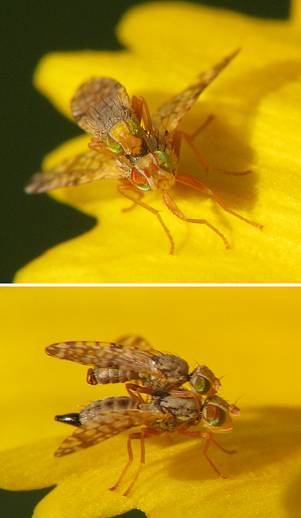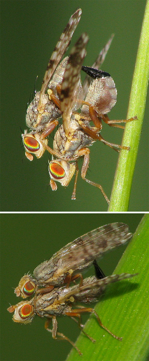 Hi, I can't stop to photograph the many Tephritid couples that spend their honeymoon in our garden every summer. They are so cute! I think they are all Dioxyna bidentis, but I would be grateful for confirmation. Thanks, Sundew Sundew attached the following image: ![]() [194.74Kb] |