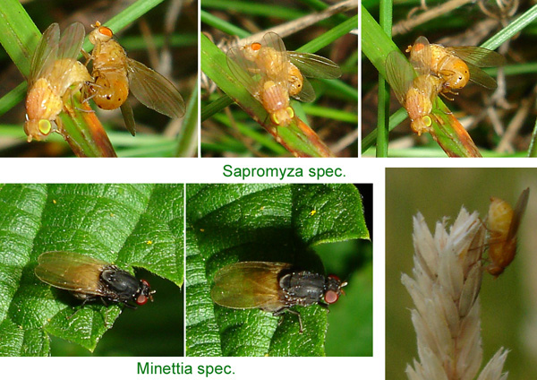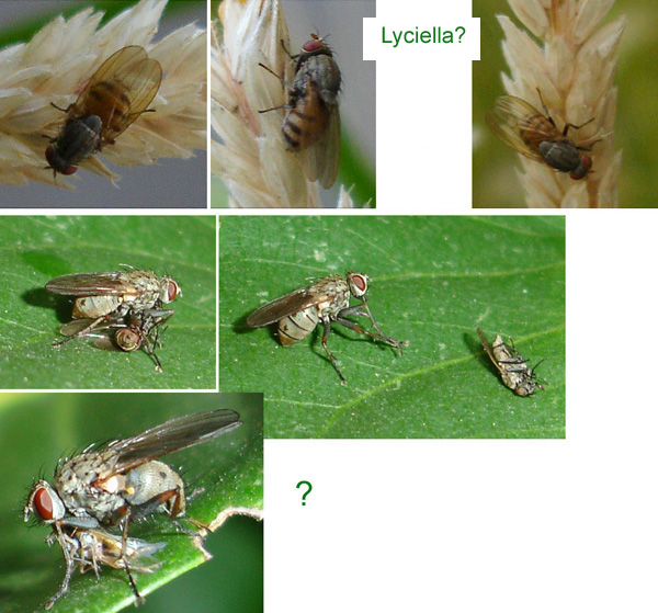 Hi, I made a compilation of photos showing probably Lauxaniidae. There is no chance to recognize species by the low magnification, but I think I am right as to Sapromyza (rather common here) and Minettia. The grey one with the striated yellow abdomen could perhaps be a Lyciella? And there were two grey ones sitting on my lilac and eating other flies that looked much like themselves (are there male-eating females like in spiders?). Judging from their habit, I suppose they also belong to Lauxaniidae, but of course I may be absolutely wrong. Confirmation, correction, and identification would be appreciated! Thanks, Sundew Sundew attached the following image: ![]() [155.24Kb] |