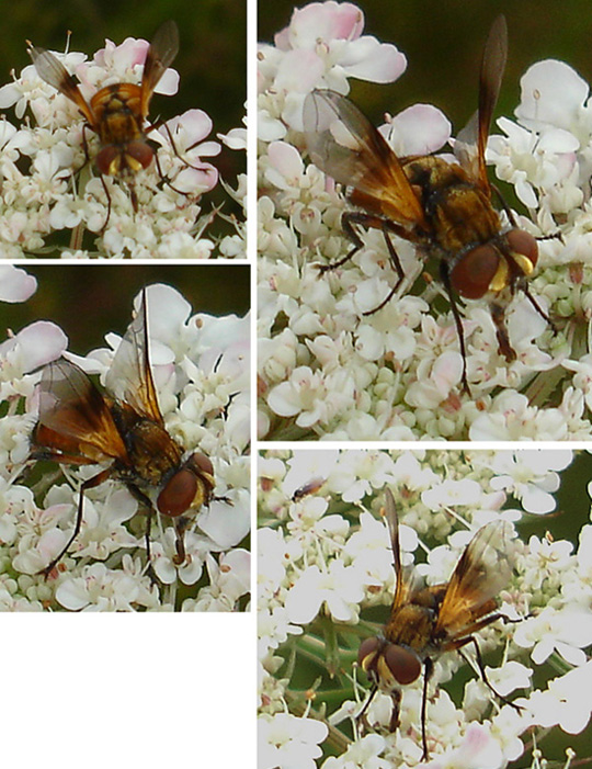 Hello, This fly, feeding on Wild Carrot, fascinated me because of its coloured wings and body. There is a gallery picture of Ectophasia crassipennis that bears a certain resemblance. This species seems to be rather variable as to colouring. I am looking forward to confirmation or correction. Sundew Sundew attached the following image: ![]() [193.96Kb] |