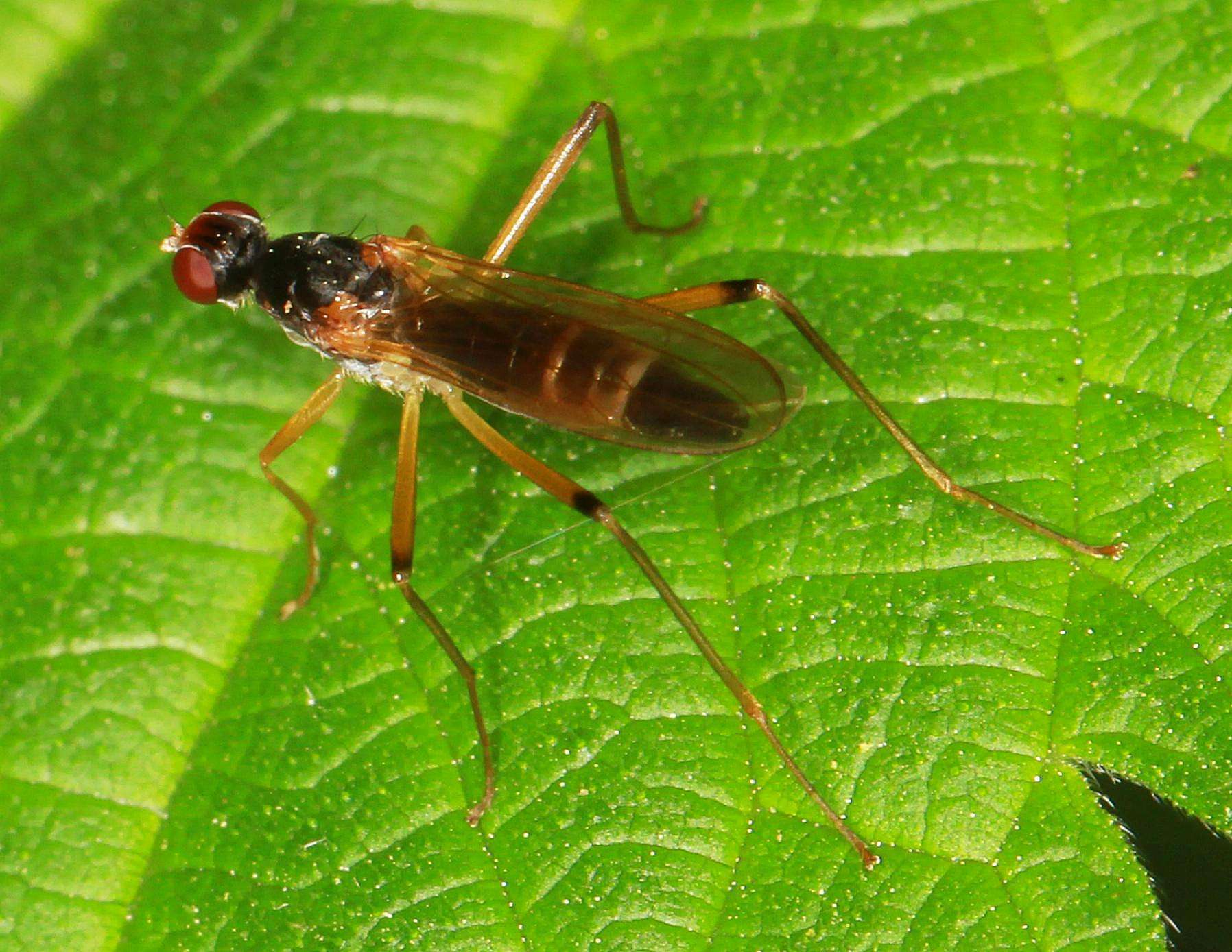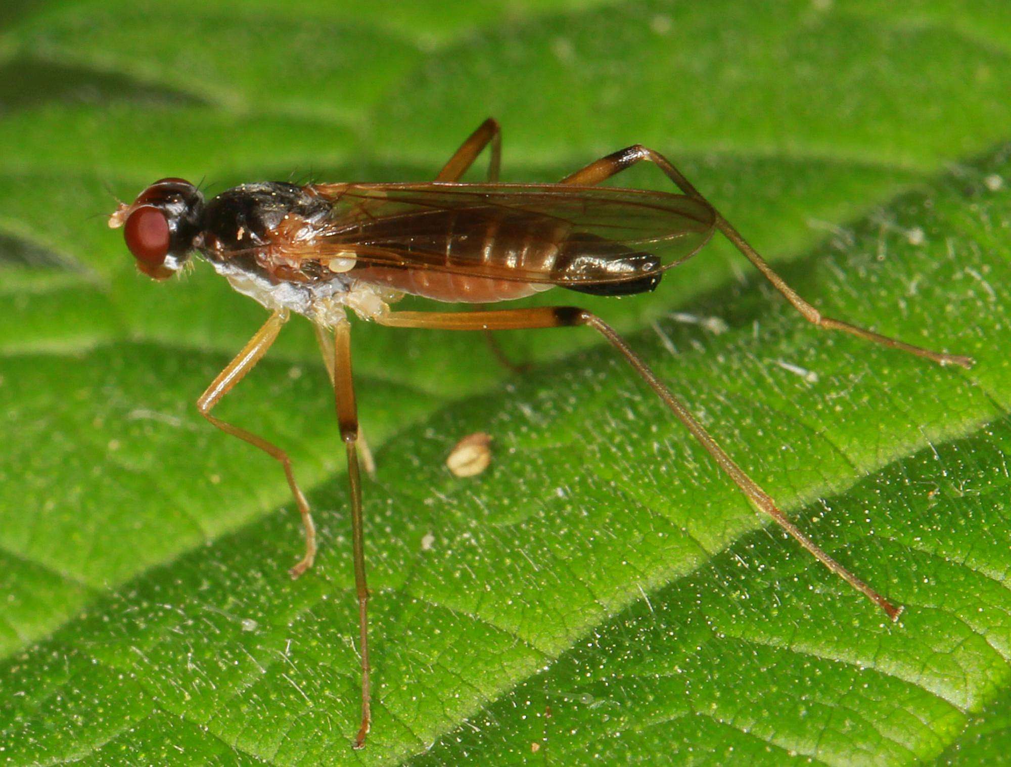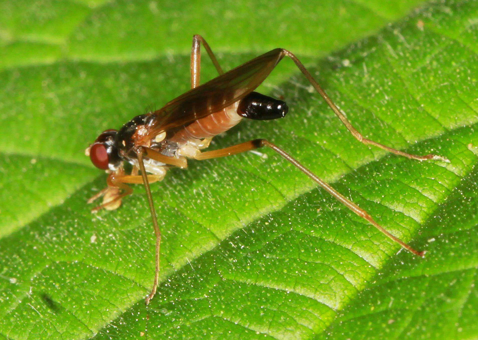 It can only be Neria nigricornis: http://micropezid...my/term/26 There are only two species with an all-black frons (the other one N. longiceps has an elongated head) N. nigricornis also has a shining thorax which picks it out from other Neria. A good find. Interesting to see the ovipositor shape, sort of tubular and shining black but without the sharp kink typical of N.cibaria I would be grateful for the detailed Lat/Long for this. Better still, upload it to iNaturalist (see https://www.inatu...tanypezids) |