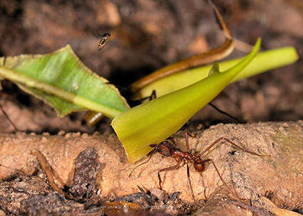 Please can some one put a species name to this Phorid fly (just above the leaf. It was attacking a line of Leafcutter ants (Atta spec.) ant workers. Rio Tambopata, Peru. THX.